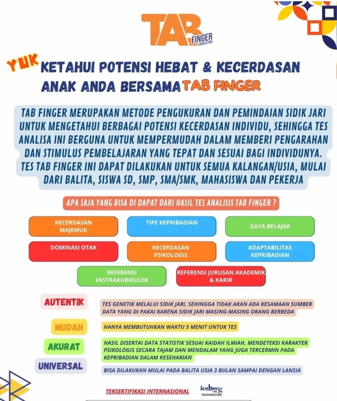 Tes TAB Finger membantu orang tua, siswa, dan pendidik memahami karakter psikologis, kecerdasan majemuk, adaptabilitas kepribadian, hingga memberikan referensi ekstrakurikuler serta jurusan akademik dan karier yang paling sesuai dengan potensi alami individu. Hasil tes ini sangat bermanfaat sebagai dasar pengarahan dan stimulus pembelajaran yang tepat, baik dalam sistem homeschooling maupun pendidikan formal.