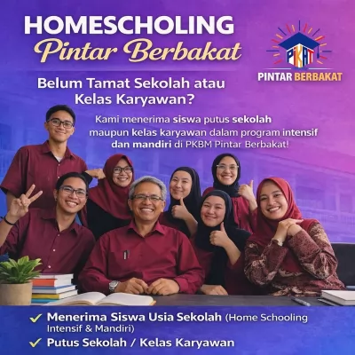 PKBM Pintar Berbakat menghadirkan program homeschooling jenjang SD, SMP, dan SMA dengan ijazah resmi sesuai Undang-Undang Pendidikan Indonesia. Program ini menjadi solusi bagi orang tua yang menginginkan pendidikan fleksibel namun tetap berkualitas dan diakui negara.